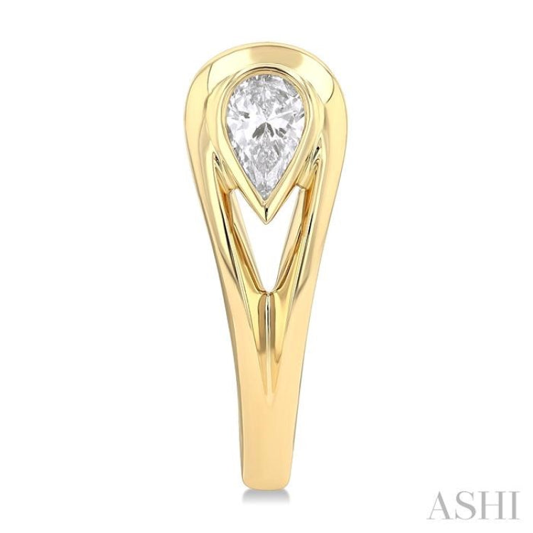 These diamond half hoop fashion earrings offer a refined twist on a classic silhouette. They deliver a distinctive sparkle that complements both casual and sophisticated looks. Each earring showcases an elongated pear-shaped front that draws the eye. The design features an open-window pear-shaped cutout at the top, where a bezel set 1/6 Ctw pear cut diamond fills the upper section with a subtle yet captivating brilliance. Secured with push-back earnut closures for a comfortable and reliable fit, the earrings combine style with everyday wearability. The fashion half hoop earrings are styled in a polished finish 14 karat yellow gold. Total diamond weight is 1/3 Ctw.