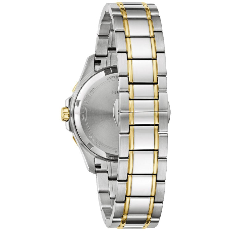 From the legendary Bulova Marine Star collection, this sporty and elegant ladies’ timepiece offers unrivaled style. The gold and silver-tone stainless steel case features a modern design with a bold crenellated fixed bezel and symmetrical case flanks. A flat sapphire crystal and protected crown provide modern reliability which is furthered by 100m of water resistance. The iridescent mother-of-pearl dial adds a captivating twist to the timepiece, with eight diamond hour markers and a refined gold-tone handset with luminescent fill for superb legibility in all conditions. The watch is paired with a matching two-tone quick-release stainless steel bracelet with a push-button deployant closure that provides both comfort and security. For timeless elegance no matter the occasion, this Bulova ladies’ timepiece makes the perfect companion.